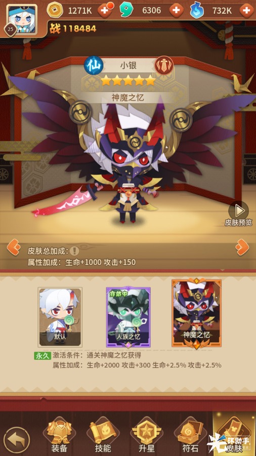玩家通过点击式神属性面板中的「皮肤」按钮就可进入皮肤界面,里面会说明其「激活条件」以及激活后的「属性加成」,玩家可以一目了然。值得我们注意的是,拥有多款皮肤的式神,解锁多款皮肤的属性加成是可以累积的,假设——A皮肤+1000生命,B皮肤+500生命,那么当这位式神解锁了AB两款皮肤之后,将获得1500的生命值加成。目前大部分皮肤的激活条件都是6星+100皮肤券,6星式神相信都难不住各位御妖师,但是皮肤券在游戏中的产出比较稀少,除了可以在日常商店以及开服活动中获得,还可关注各种活动中有无产出,一旦发现有产出可千万不能错过!