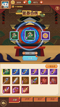 获得了装备之后,式神属性里,我们点击“一键穿装”就可以快速武装式神了。在游戏中我们会在背包里发现大量低稀有度的武器,我们可以选择一键合成这些装备,以获得更高希有度、更高星级的装备。需要注意的是,橙色三星以上的武器是有套服效果的。套服搭配攻略将会在攻略——装备搭配篇里向大家详细说明。