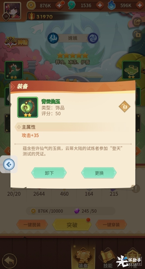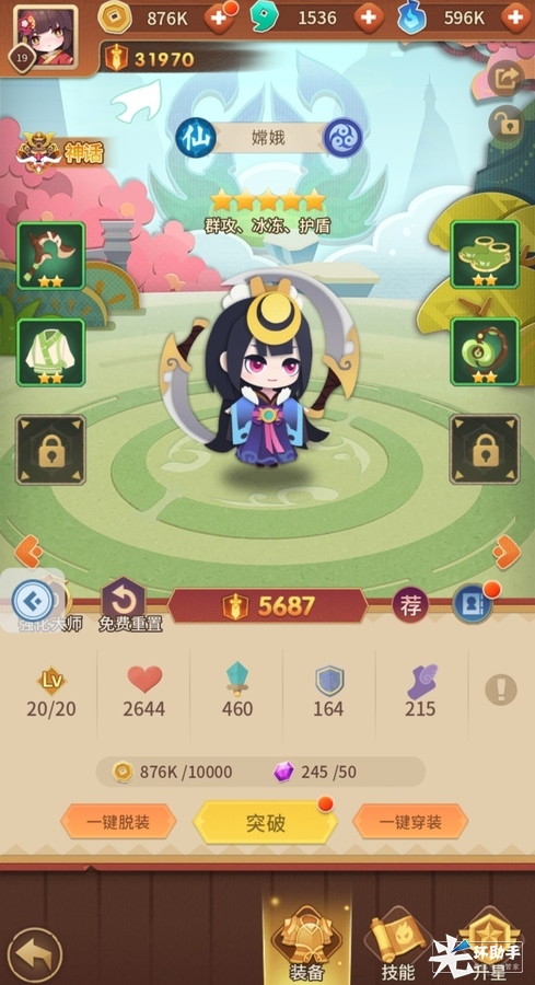 获得了装备之后,式神属性里,我们点击「一键穿装」就可以快速武装式神了。