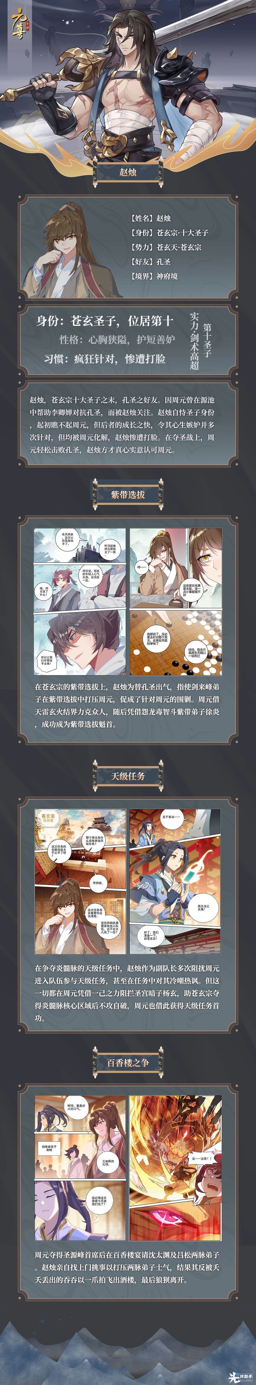 《元尊》源师档案-苍玄宗第十圣子—赵烛伊辛贝露发布于 2023-05-22“连师兄的好事都敢坏?这小子胆子也太肥了。”赵烛,苍玄宗十大圣子之末,孔圣之好友。因周元曾在源池中帮助李卿蝉对抗孔圣,而被赵烛关注。赵烛自恃圣子身份起初瞧不起周元,但后者的成长之快,令其心生嫉妒并多次针对,但均被周元化解,赵烛惨遭打脸。在夺圣战上,周元轻松击败孔圣,赵烛方才真心实意认可周元
