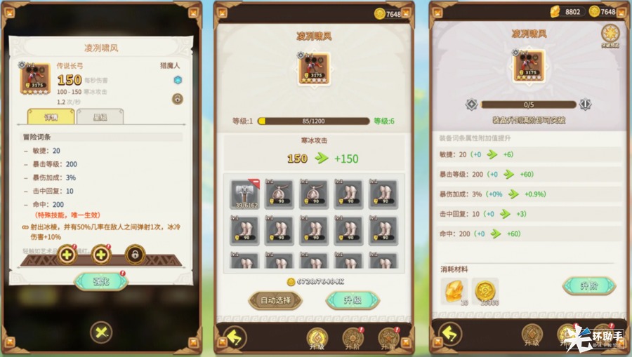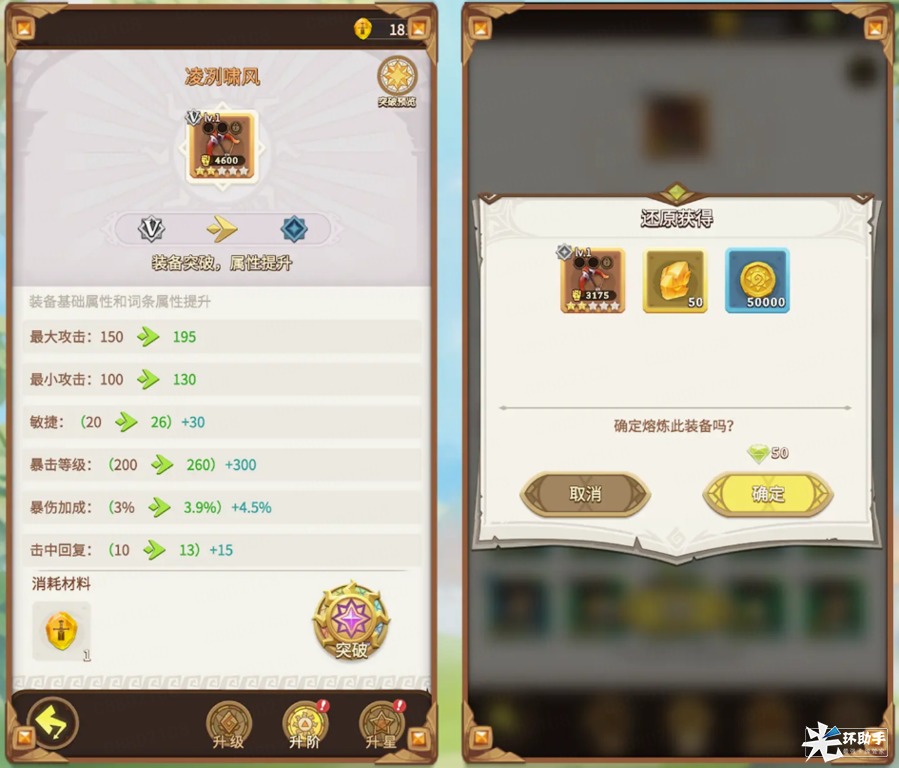 装备升级:消耗秘银锤或装备可进行装备升级操作,装备的等级越高,提供的属性越强。