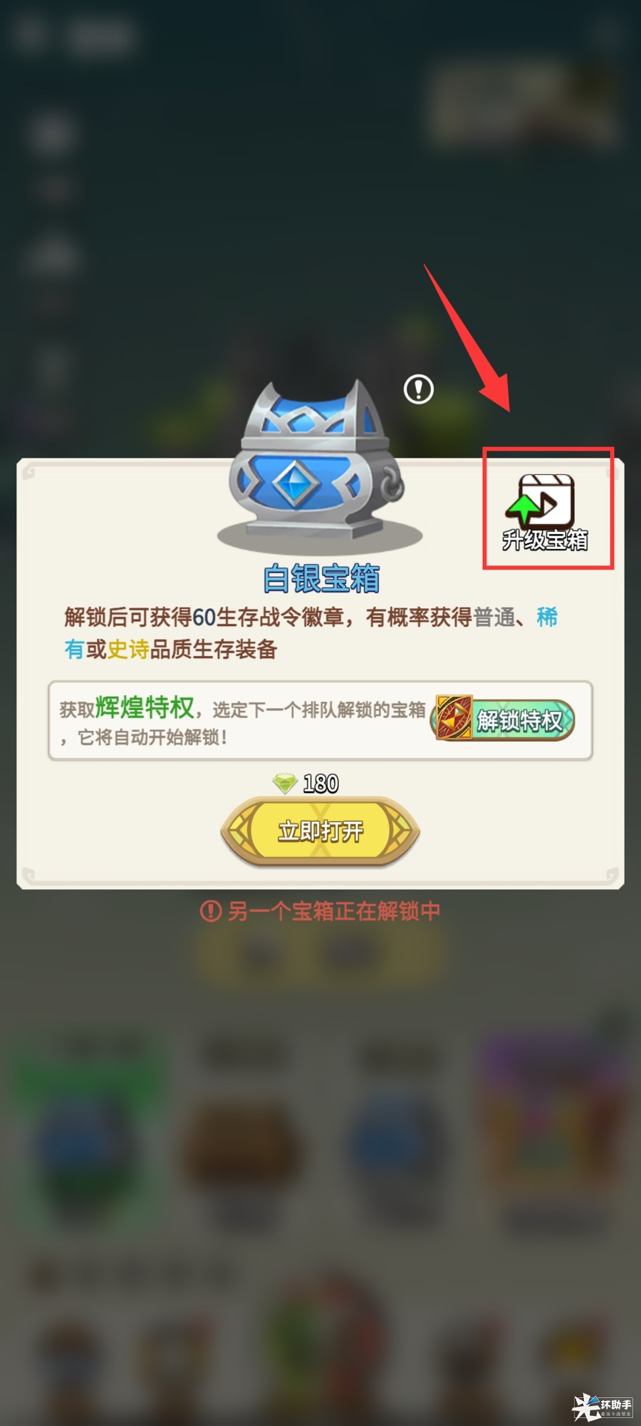 PS:宝箱品质越高,可获得的生存装备品质越高,可通过观看广告升级宝箱;关卡越往后,获得高品质宝箱的概率越高。