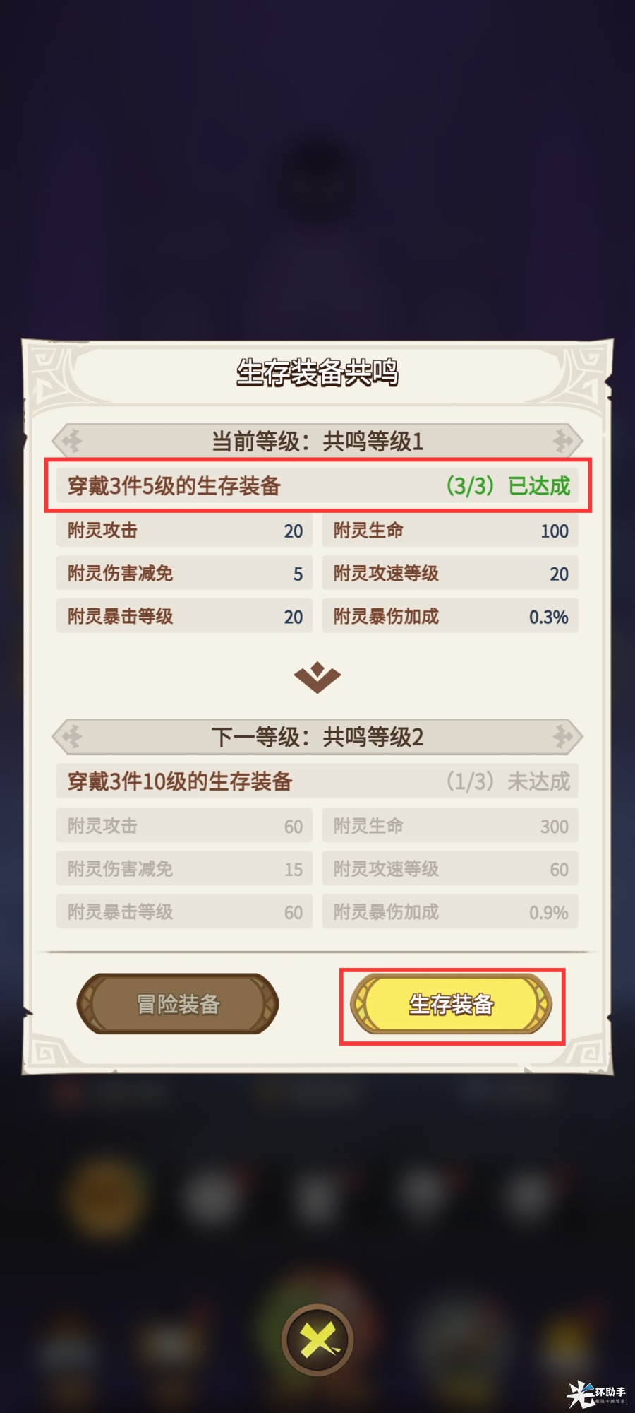 可提高玩家参与生存玩法时初始角色的属性,通过附灵、生存装备提高角色属性可以应对后续关卡更轻松。另外,生存装备还具有冒险词条,可在冒险模式中生效。