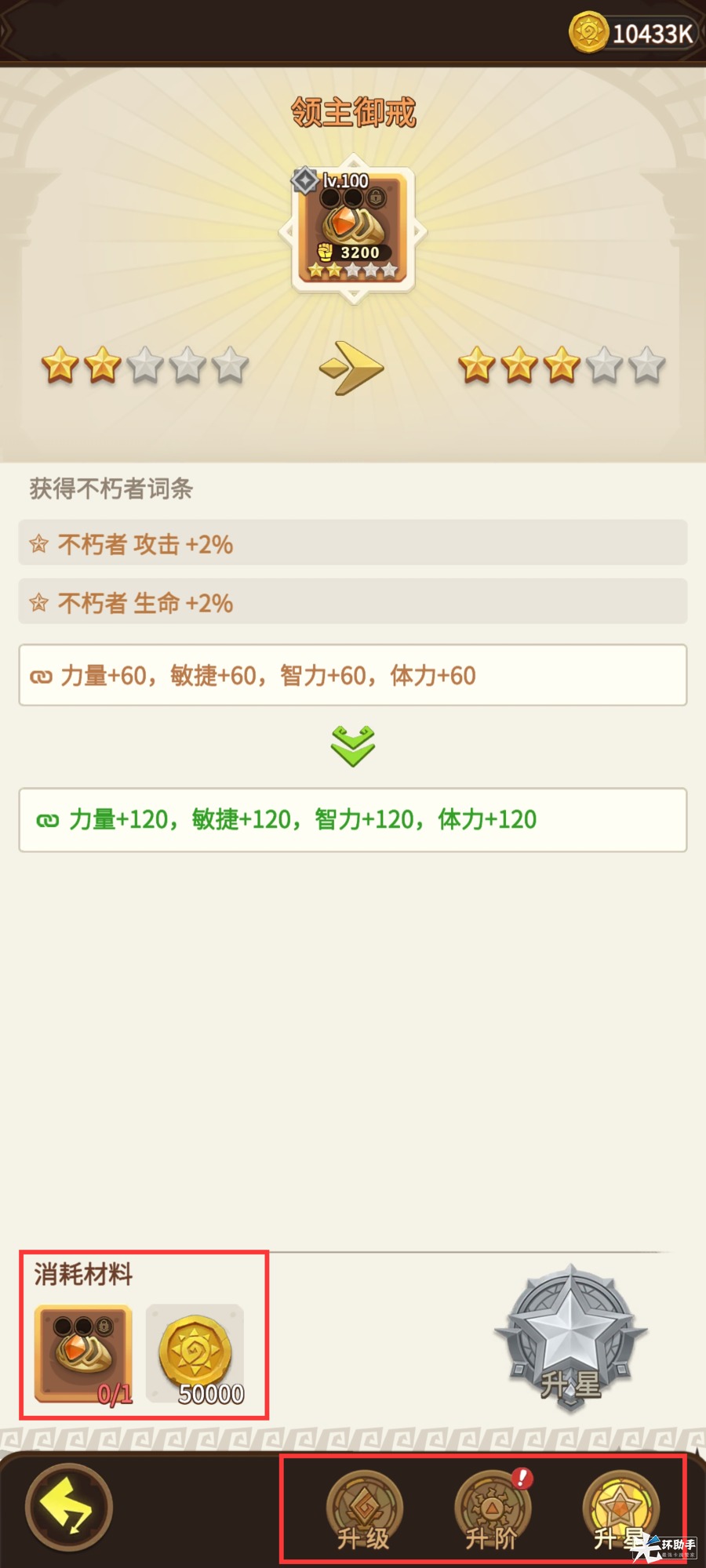 装备品质可通过上述提到的方式提升,等级和共鸣的提升方式和生存装备提升相同,另外,星级提升同样在装备强化页,需要使用相同的物品方可升星。宝石可直接镶嵌(通过购买不朽月卡、挑战厄难边境获得),套装效果需要穿戴指定数量的同系列装备方可激活。
