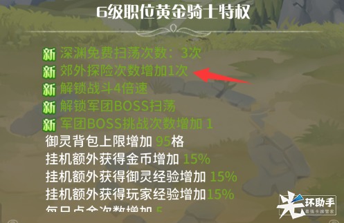 这个每日挑战次数是每日必刷的,神典石是否购买挑战次数就看个人了,职位等级黄金骑士可以增加郊外探险次数1次