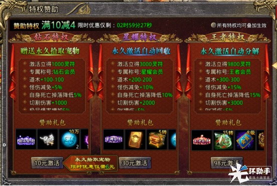 2. 平民玩家进入游戏后建议只充前2档赞助特权,只需36块钱即可领取永久拾取宠物+自动回收+大量切割伤害以及怪伤减免。这样挂机可获得大量的装备和混沌神石,混沌神石可兑换大量充值灵符。