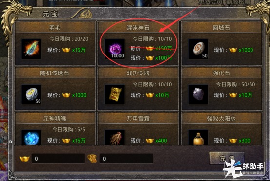 5. 元宝商城和灵符商城限购的道具尽量买完,全是好东西!比如一天能兑换100000混沌神石,而25000混沌神石即可兑换1000灵符(价值10元),即一天可白嫖40元充值的灵符。
