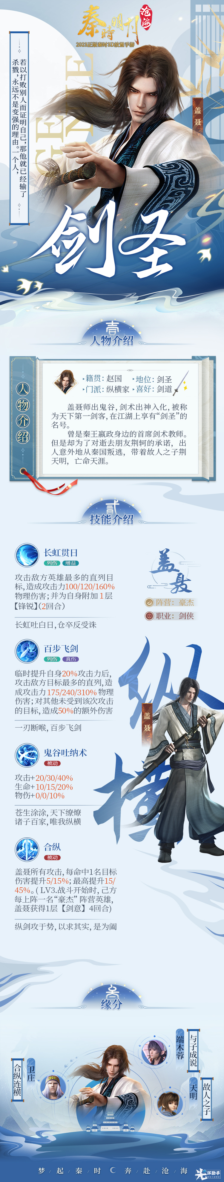 春秋战国七百年来,春秋五霸,战国七雄,每一国每一朝兴衰的背后,都有一个共同的名字——鬼谷。历代首领皆被称为“鬼谷子”,代表纵横掌握天下命运。而每代鬼谷子一生只收两名弟子,一纵一横。而盖聂便是师出鬼谷,因出神入化的剑术,而被江湖人称“剑圣”。