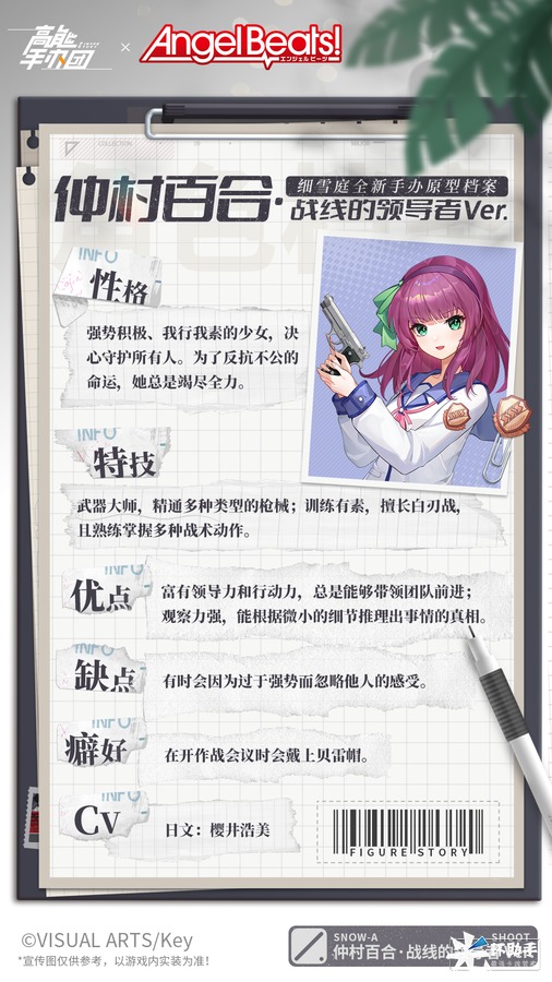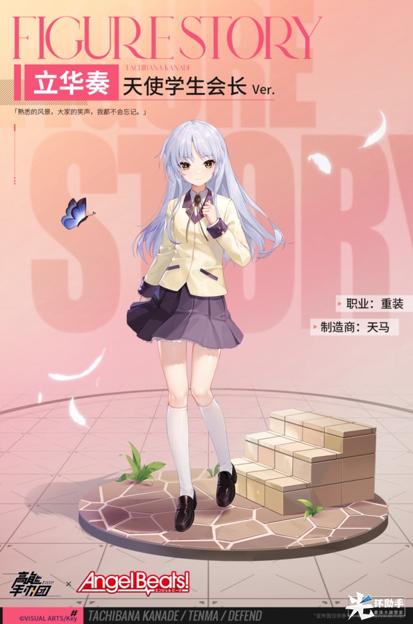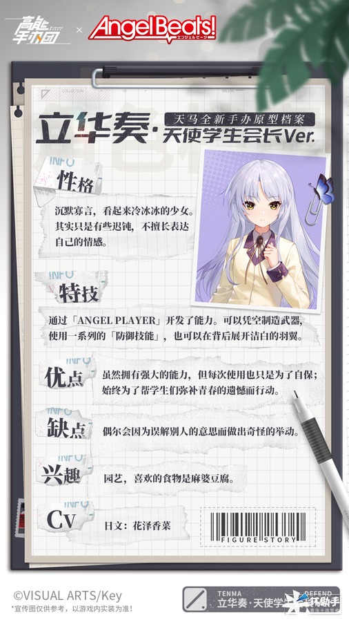 《Angel Beats!》是由同名动画改编的恋爱冒险游戏,游戏讲述了死后世界中少年少女们建立“死后世界战线”共同作战,挑战命运及强大神使——“天使”的过程中所发生的故事。本次联动中,两位来自《Angel Beats!》的人气角色将在《高能手办团》全新版本登场,快来一起了解一下她们吧!