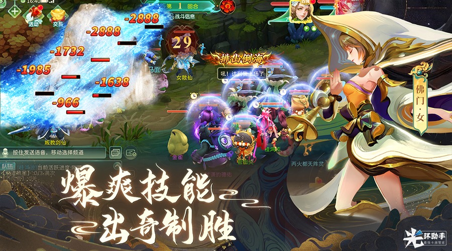 回合制的战斗方式,玩法注重阵容搭配讲究策略,灵活的技能配置,巧妙的招数组合。智慧取胜、以弱胜强,不氪金也能一路斩妖除魔!