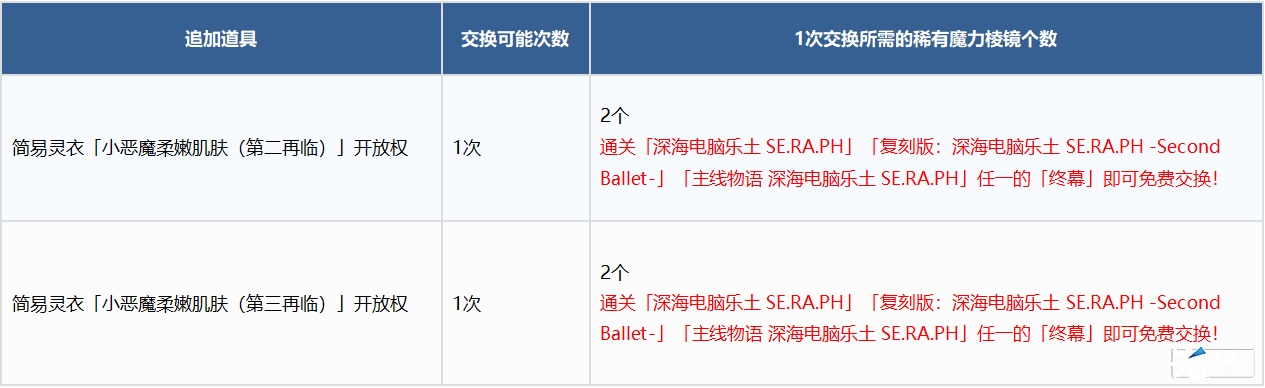 ※使用2个稀有魔力棱镜交换简易灵衣「小恶魔柔嫩肌肤(第二再临)」开放权、或简易灵衣「小恶魔柔嫩肌肤(第三再临)」开放权后达成免费交换灵衣开放权的条件的情况下,将返还交换中使用的2个稀有魔力棱镜至礼物盒。