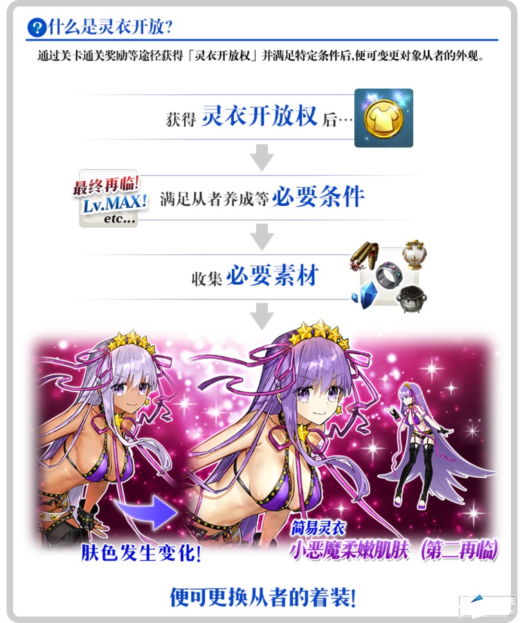 ※「灵衣开放」后战斗形象及头像将自动切换。通过从者详情界面可以变更回「灵衣开放」前的状态或其他灵基再临阶段。