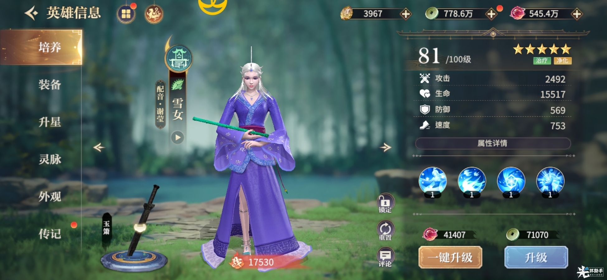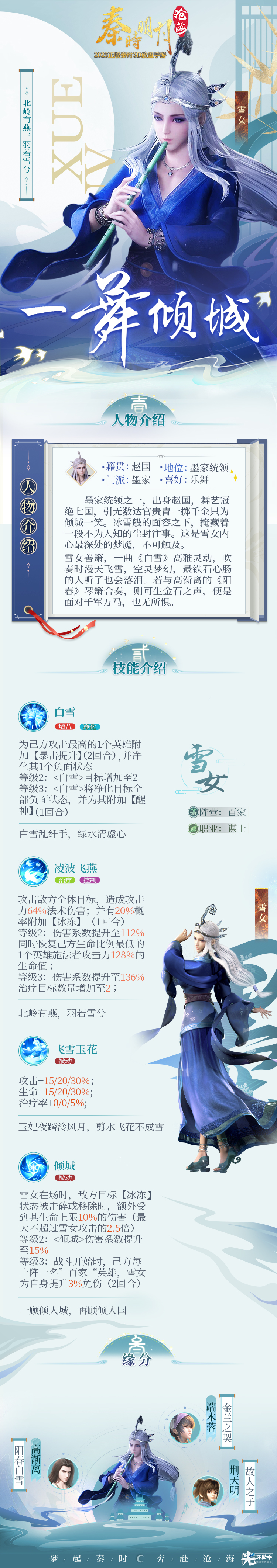 在《秦时明月:沧海》手游中,雪女定位为辅助型英雄,既有控制、净化,也能治疗,是一个非常全面的辅助英雄,同时还能兼具群体伤害。在实际战斗中,可以为我方队友提供更好的输出环境,大幅提升胜率。不仅如此,雪女还拥有独一无二的【倾城舞】外观,能为其带来全方位属性加成。