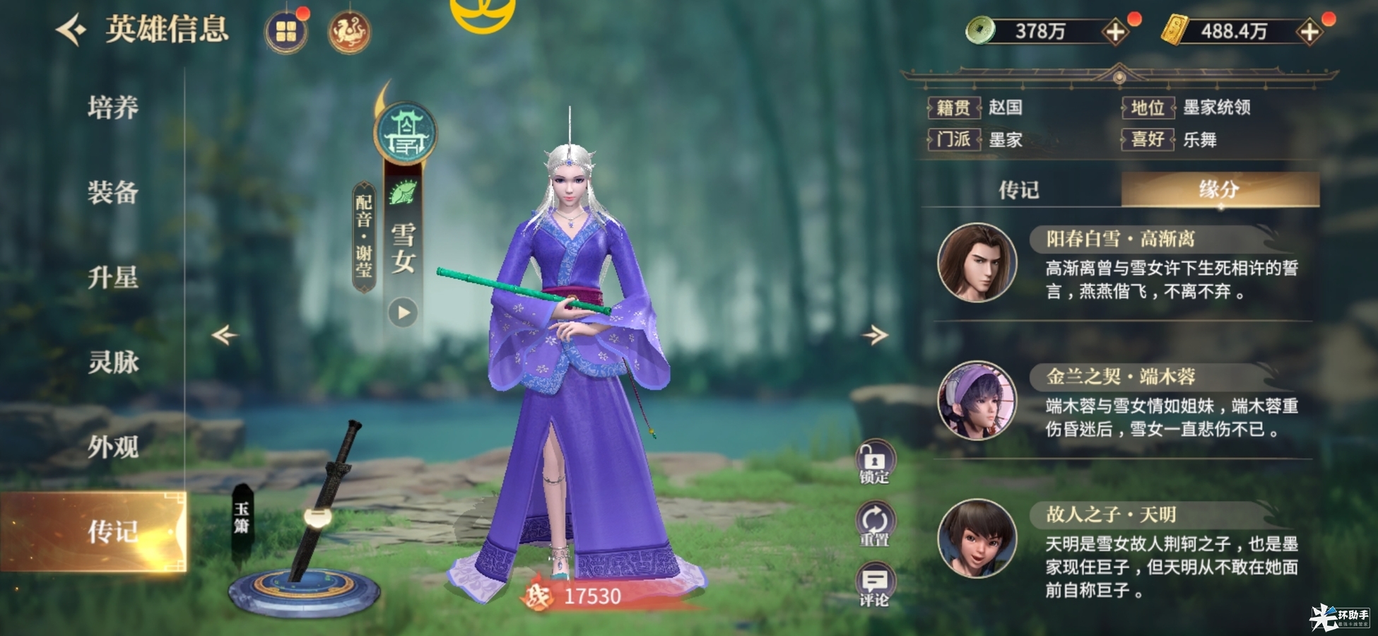 雪女不仅善舞,也善箫,一曲《白雪》高雅灵动,吹奏时漫天飞雪,空灵梦幻,最铁石心肠的人听了也会落泪。若与高渐离的《阳春》琴箫合奏,则可生金石之声,便是面对千军万马,也无所惧。