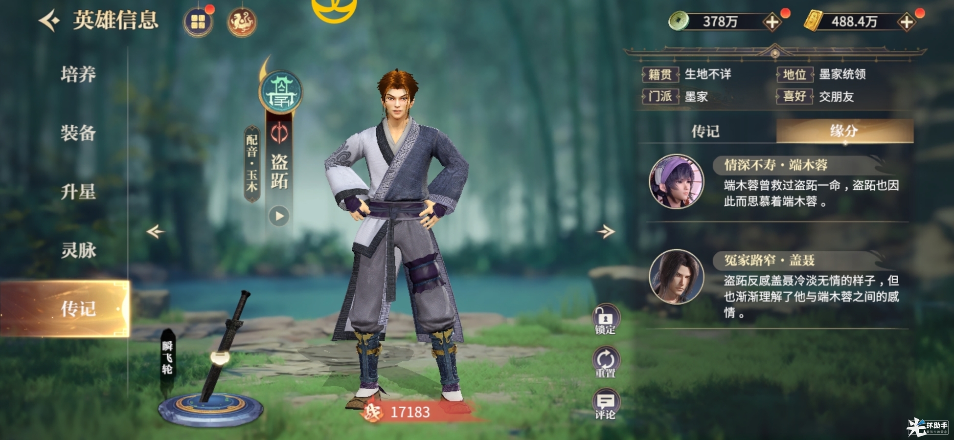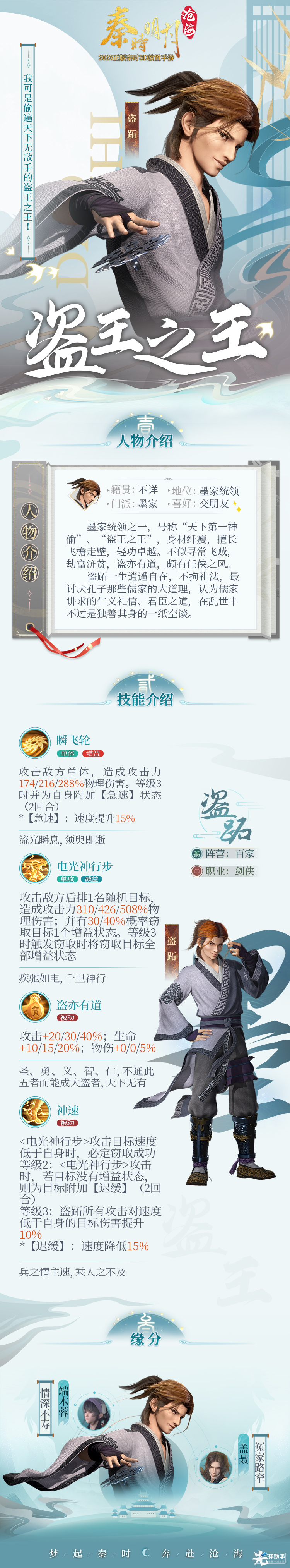 盗跖号称“天下第一神偷”、“盗王之王”,擅长飞檐走壁,轻功卓绝,劫富济贫,盗亦有道,颇有任侠之风。盗跖看似“油嘴滑舌”,但骨子里也有着认真、执着的一面,危难时刻绝不临阵脱逃。