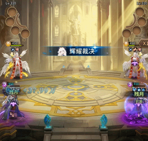 裁决审判雷动风行,圣罚大祭司对生命值最低的敌方所处一列造成大量魔法伤害,根据伤害总量百分比为友方单体回复生命;并消耗所有【幻羽】复活友方:消耗【幻羽】数量越多,复活人数越多。