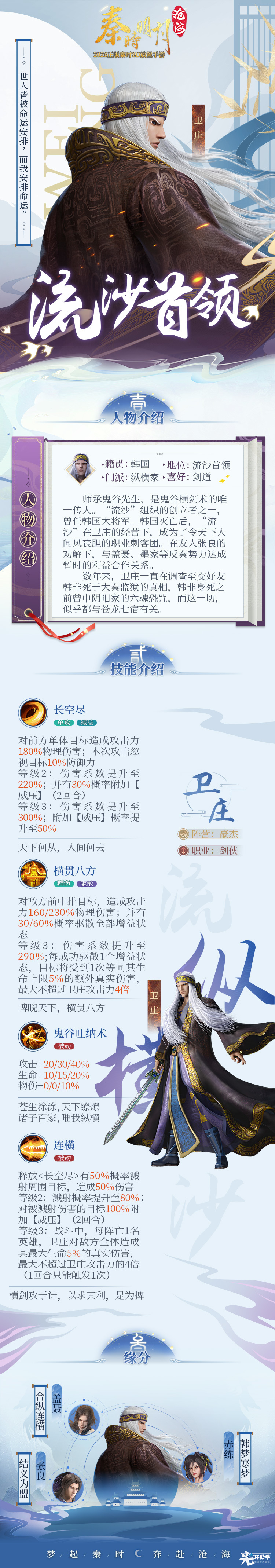 在《秦时明月:沧海》手游中,卫庄的定位是豪杰剑侠,其技能全面,既有单体伤害的【长空尽】,也有群伤技能【横贯八方】。卫庄在游戏中不仅拥有过人的输出能力,同时他还兼具驱散技能,可以将对方全部增益状态驱散,为我方伙伴提供更为有利的输出环境,颇有大将指点江山之风。