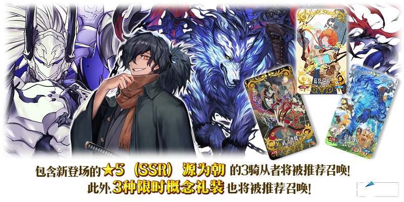 为了纪念限时活动「南溟弓张八犬传」的相关从者中,包含新登场从者「★5(SSR)源为朝」的3骑从者和3种限时概念礼装将被推荐召唤!