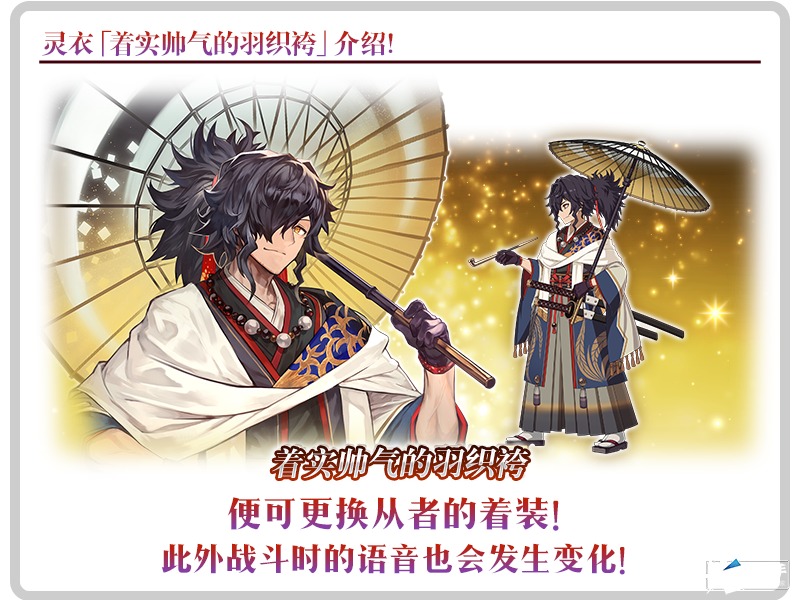 达·芬奇工房内的「灵衣缝制」中,将追加过去登场过的「★3(R)冈田以藏」的灵衣「着实帅气的羽织袴」开放权获得关卡!