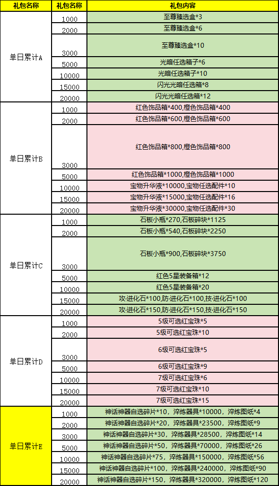 1、当日累计充值总额达到对应档次时,玩家可自行选择A-E中的其中一档获得返利;档位奖励不叠加(如玩家充值了3000元,只可申请2000元的奖励,不可申请1000元+2000元奖励