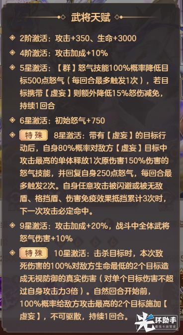 搭配思路上,幻吕布可以凭借【虚妄】状态能给敌方主C武将锁定点杀追击效果,幻吕布升到8星后,发挥出高伤追击特色,带【虚妄】目标行动后幻吕布能给【虚妄】目标再进行一次怒气技能追击,所以一回合幻吕布能对主C造成2次技能伤害,升到10星后的完全体幻吕布开场会给2个攻击最高的目标挂【虚妄】,一回合内就能连续对敌方主C攻击3次,还会溅射伤害,凭借幻吕布的高额伤害,2回合内就能秒掉敌方主C武将,可以说幻吕布对非常克目前的单核袁绍,黄忠,司马懿阵容。