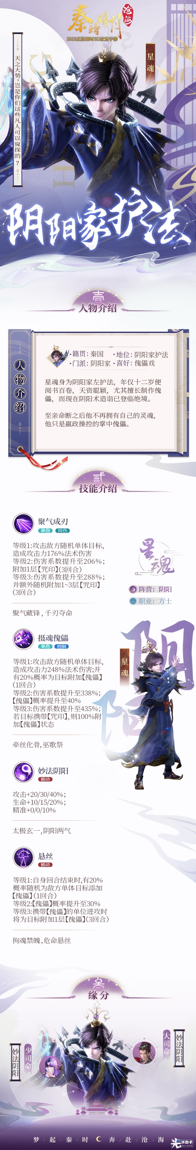 《秦时明月:沧海》人物介绍之阴阳家护法星魂白纸扇发布于 2023-07-28星魂身为阴阳家左护法,年仅十二岁便阅书百卷,天资聪颖,尤其擅长制作傀儡,而现在阴阳术造诣已登临绝境。 至亲命断之后他不再拥有自己的灵魂,他只是嬴政操控的掌中傀儡。 在《秦时明月:沧海》手游中的二技能和四技能更为凸显其傀儡大师的特质,将敌方拘魂禁魄。有星魂在的战斗可谓是将敌方掌控在执掌之中!
