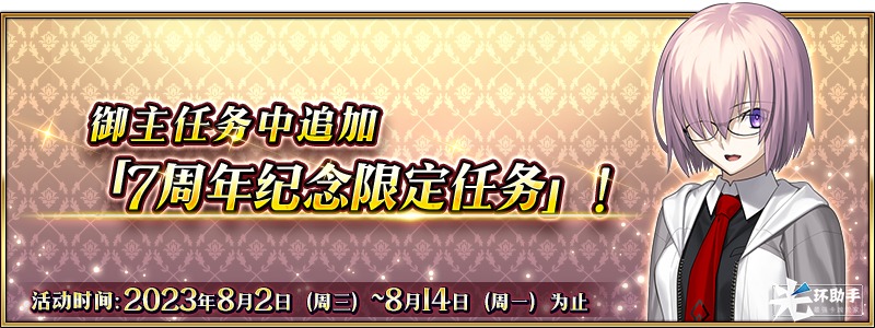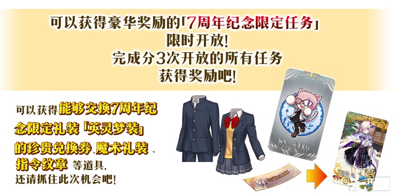 为了纪念「Fate/Grand Order」的7周年,「御主任务」的「限定」一栏内将追加「7周年纪念限定任务」!