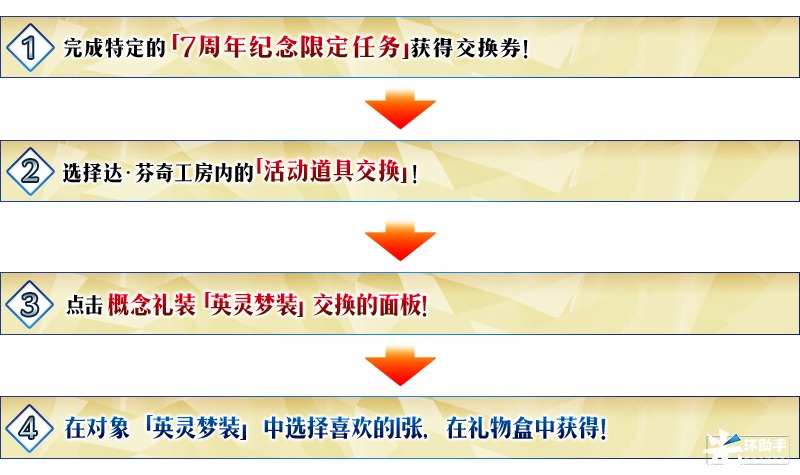 使用完成「7周年纪念限定任务」可以获得的「FGO 7th Anniversary 英灵梦装兑换券」进行交换,可以获得最多2张限时概念礼装「英灵梦装」。