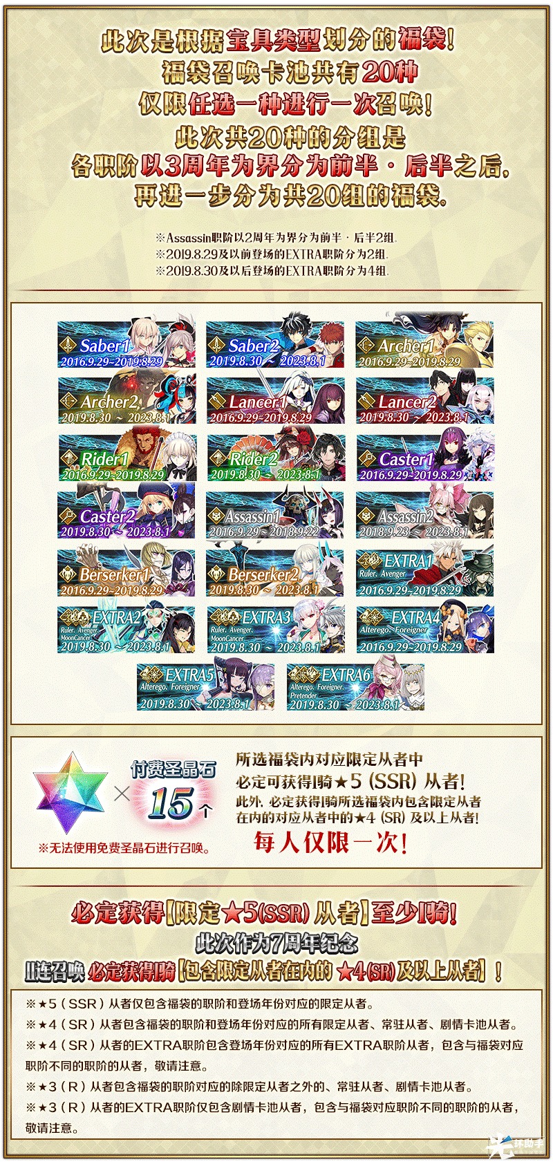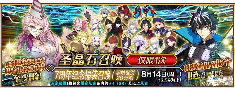 ※「7周年纪念福袋召唤(职阶区别20分割)」中可以获得的从者仅包含各召唤卡池的对象从者。
