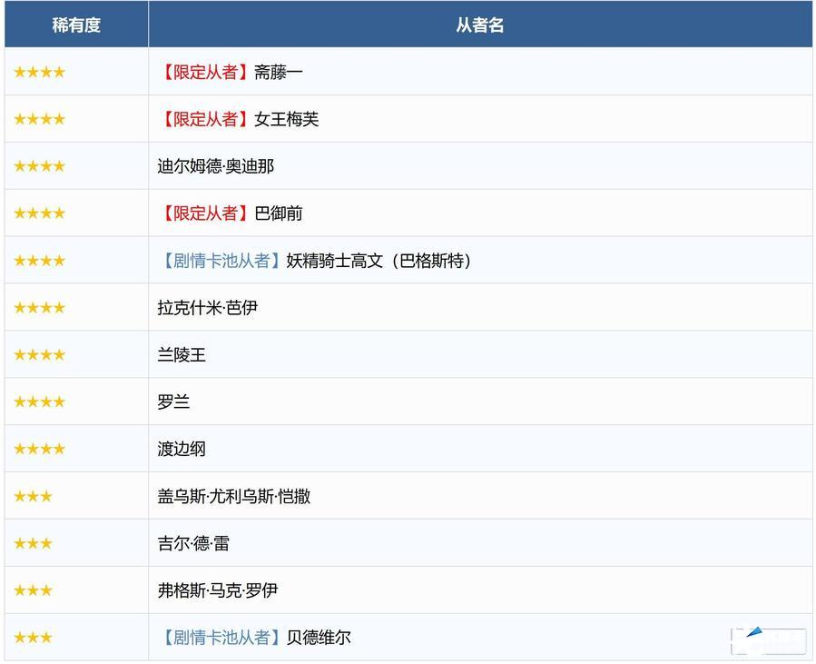 ※有关「★4(SR)芭万·希(妖精骑士崔斯坦)」,「★4(SR)妖精骑士崔斯坦」完成灵基再临第3阶段后名称变为「★4(SR)芭万·希」。