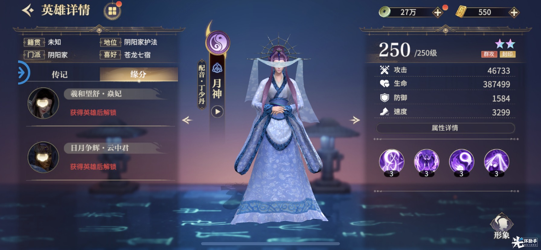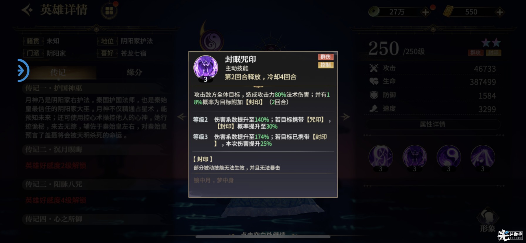 月神在封印之外,四技能还会在战斗开始使随机选择1名地方附加【移魂】状态,月神在战斗中受到所有的负面状态都会同步给受【移魂】影响的敌方,让控制能力进一步的提升。