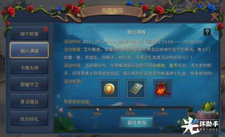 艾叶飘香,荣耀城广场举办了烟火晚会迎接端午佳节的来临。勇士们欢聚一堂,赏烟火、吃粽子、抢红包、天降之礼各类活动热闹非凡!!活动期间内,在荣耀城烟花旁,即可获得经验、金币奖励;起大家吃粽子,同阵营勇士获得奖励加成;烟火堆附近还会定时掉落端午礼盒,快来参加活动吧~
