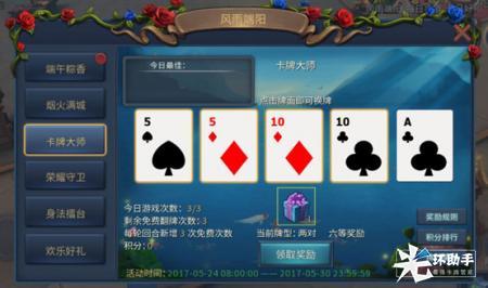 活动期间,玩家每天可参与本活动3次,每次拥有3次免费换牌的机会,通过牌面的类型来获得相应的奖励和积分,每日积分最高的玩家将会获得排名奖励。快来试试你的运气吧!