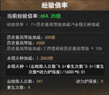 那经验倍率的来源是什么呢?通过游戏说明,我们可以知道每个研究和工作的经验倍率是算出来的。影响参数是历史当前研究/工作的历史最高等级,然后就是永恒火种加成。历史最高等级很好理解,慢慢刷就好。重点就又回到上文提到的永恒火种加成,也是这篇攻略的重点了,永恒火种加成是每次轮回后会增加的一个值。影响永恒火种的参数有:击败敌人总数,动力炉强度,重生次数。这三个参数都是只会增加,不会减少的。所以只要大家坚持玩下去,永恒火种就会一直增加。永恒火种一直增加,经验倍率就会一直增加。经验倍率一直增加,那把研究学到满级,不是指日可待?