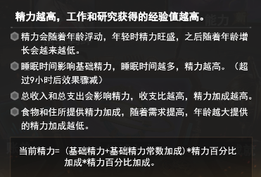 首先就是将研究中带有精力加成的尽量研究到满级,也就是脑域开发研究,研究只有这一个是对精力加成的,大家在选择身世卡的时候,有条件的情况下可以买一张精力加成的身世卡。初始选择能力一定要选择加精力的,可以看广告换几次,选择加精力百分比和基础精力加成的。在将睡眠时间调整到9个小时,记住要想精力高一定要吃好喝好住好在将加精力的雇佣都点上,一定不要出现金钱负债,良好的经济可以增加精力的收支比加成。