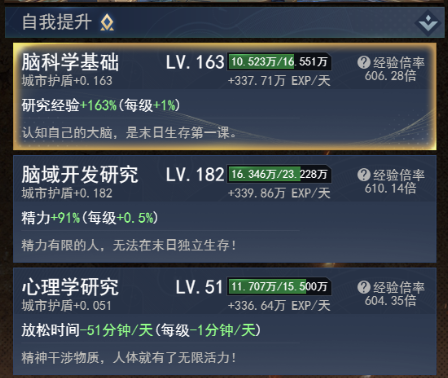 在前三个研究领域,其中自我提升中的脑科学基础和脑域开发研究需要学习到2000级以上。心里学研究只需要学到180级就足够了。然后我们下一步就是苟钱,苟钱前提就需要我们学习专业的技能知识。