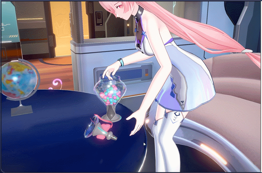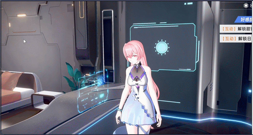 玩家可以在宿舍中通过打招呼、送礼物以及装扮房间等方式提高角色对玩家的“好感度”和环境的“氛围值”。好感越高,角色对玩家就越亲昵,给予不同的行动回应。