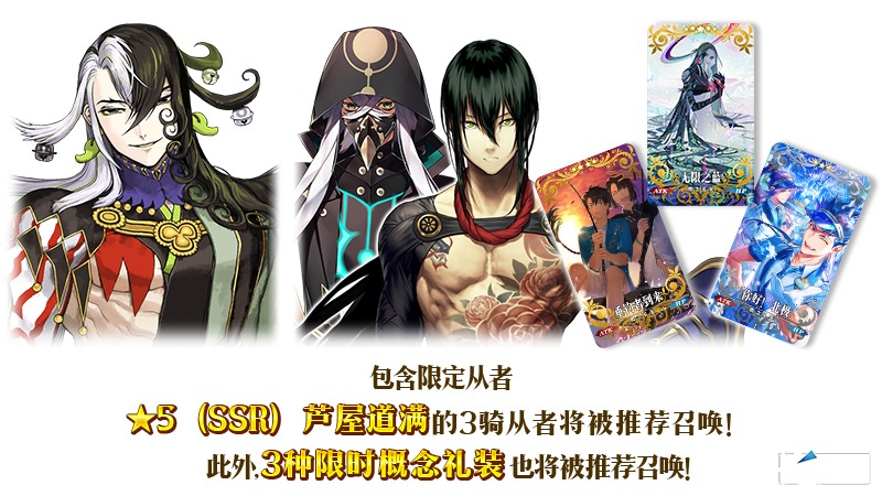 为了纪念限时活动「北极·夏日世界!~迦勒底盛夏魔园观光~」的举办,包含限定从者「★5(SSR)芦屋道满」的3骑从者、和3种限时概念礼装被推荐召唤!