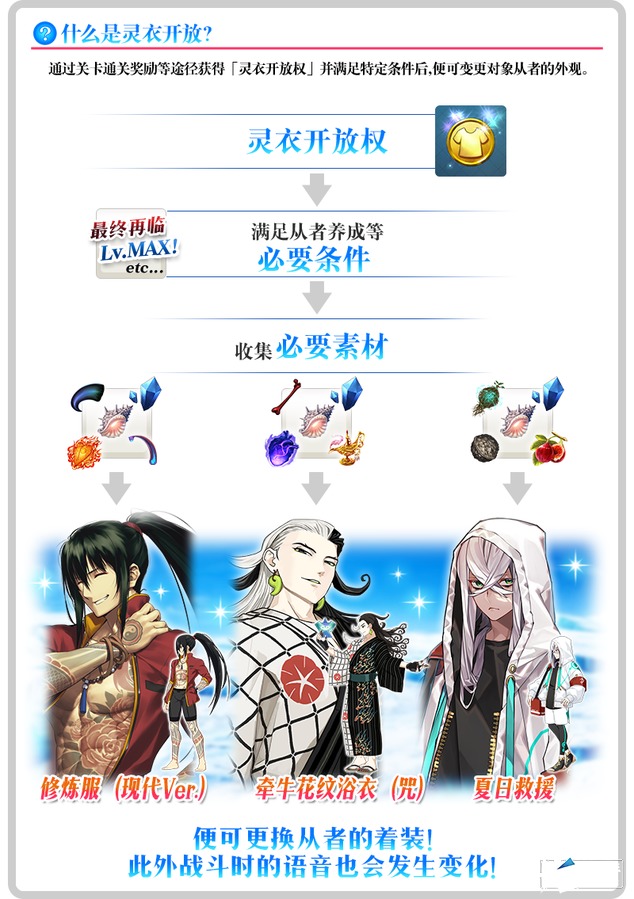 ※尚未拥有「★5(SSR)芦屋道满」「★4(SR)燕青(新宿的Assassin)」「★3(R)阿斯克勒庇俄斯」的御主可以获得灵衣开放权,但是无法进行灵衣开放,敬请注意。