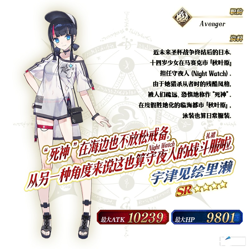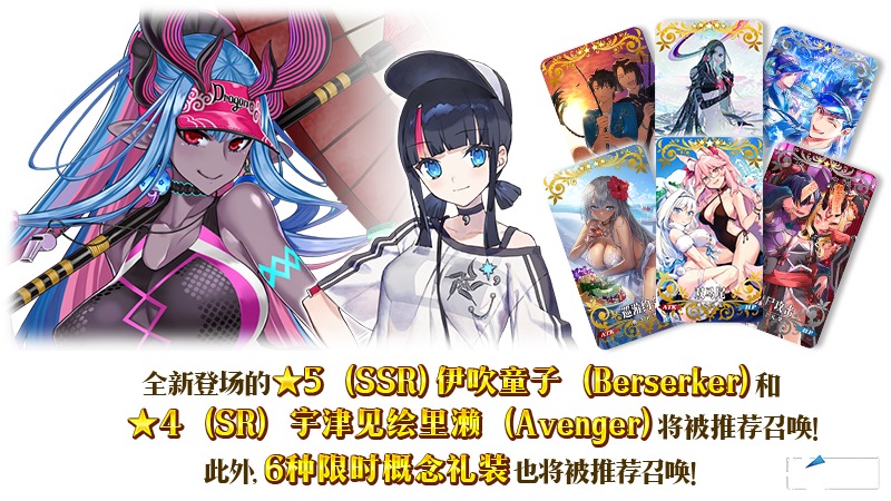 为了纪念限时活动「北极·夏日世界!~迦勒底盛夏魔园观光~」的举办,全新登场的限定从者「★5(SSR)伊吹童子(Berserker)」「★4(SR)宇津见绘里濑(Avenger)」、和6种限时概念礼装被推荐召唤!