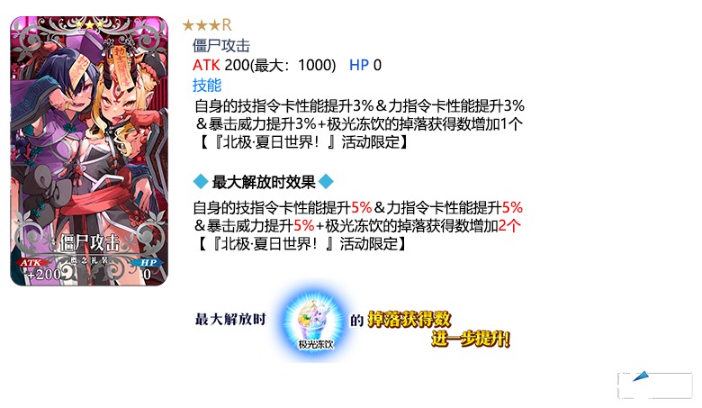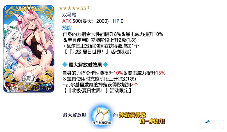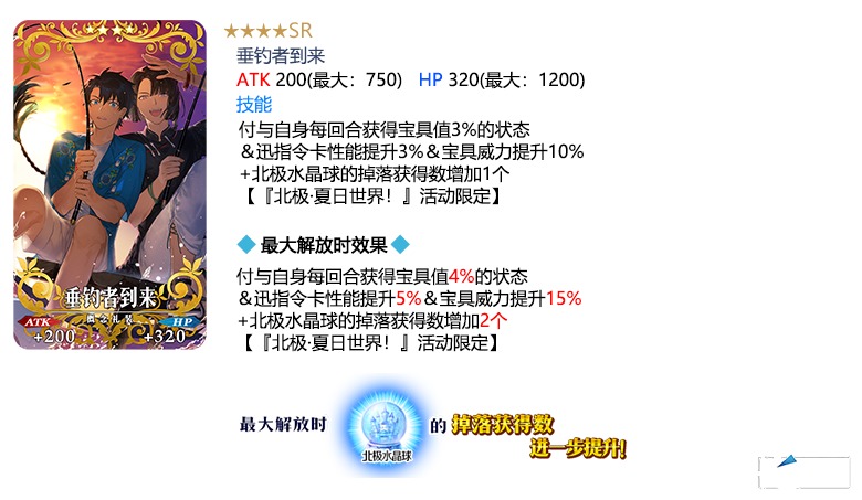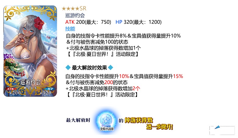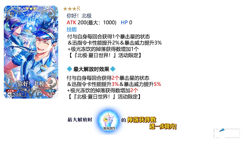 装备推荐召唤对象的6种限时概念礼装,在限时活动「北极·夏日世界!~迦勒底盛夏魔园观光~」中活动道具的掉落获得数将提升!