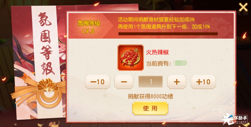饕餮盛宴热闹不可少,小乔作为气氛组必须到位。氛围道具助力主公盛宴等级再上一层楼,主公捐献[火热辣椒]可以提升氛围等级,捐献野生香菇、雪花肥牛即可获得经验加成,最高可达50%!10级不是梦,快和小伙伴一起吧。
