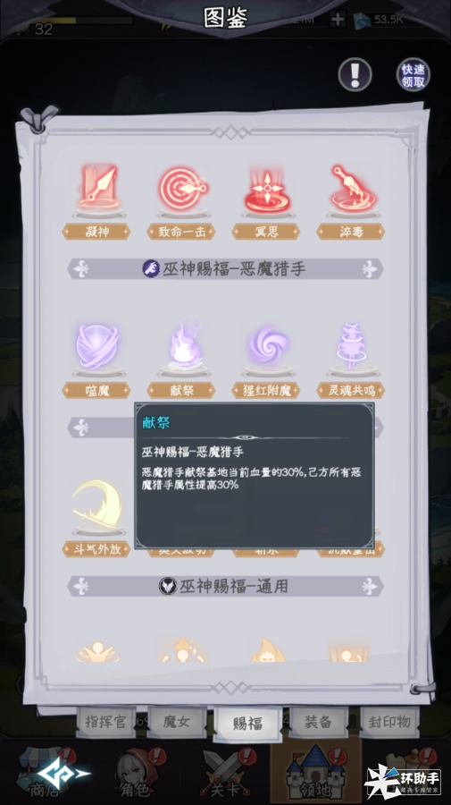 2. 由于恶魔猎手的初始技能范围还不是很大,所以在场上魔女数量不够多时比较容易漏怪,比较依赖能处理前期漏怪的指挥官。或者穿戴能够增加技能范围的装备来改善前期漏怪的情况。在战斗进入中期后可以选择尽快点出巫神赐福献祭来全方位增强魔女的能力。