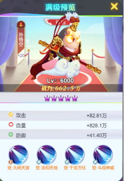 觉·大闹天宫-对前方目标,造成攻击力183%的伤害。并召唤2个替身小猴。(每个小猴可以帮孙悟空抵挡一次伤害)【觉醒技能】对前方一排目标,造成攻击力243%的伤害。并召唤3个替身小猴。(每个小猴可以帮孙悟空抵挡二次伤害);☆☆☆后觉醒该技能;