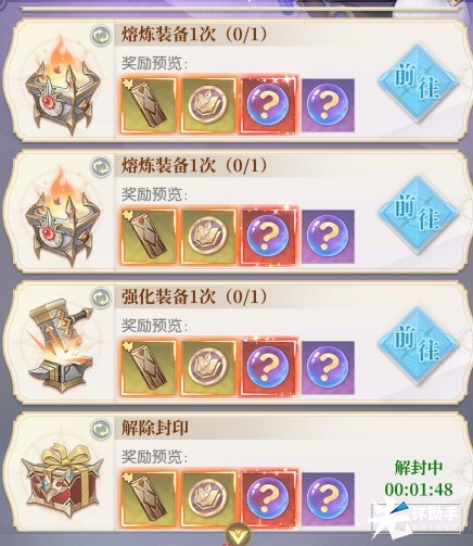 上线后,冒险者们领取今天的冒险任务,例如“解除封印”任务,玩家可以提前点击等待时间,而其他任务比如”强化装备“、”熔炼装备“等,我们也会在接下来的操作过程中间接完成它们,这样在最后我们就可以直接领取奖励啦~(PS:冒险任务奖励会随着游戏内活动的变化而变化,此图仅供参考)