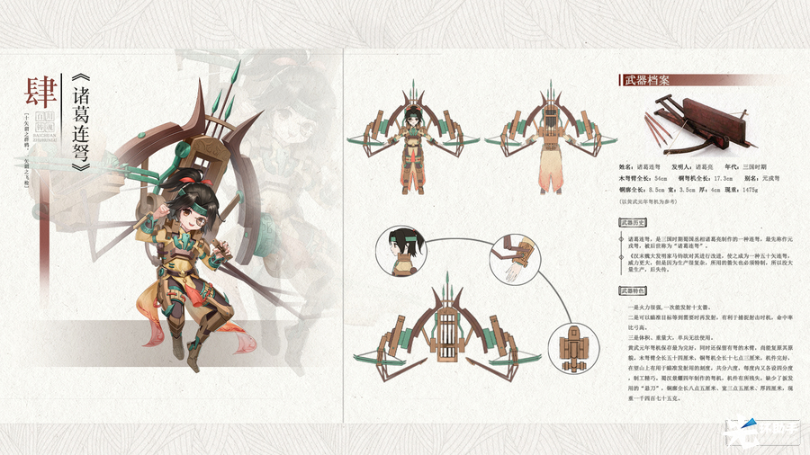 说了这么多关于诸葛连弩的来历以及特点。那么在我们《百川铸魂录》这款游戏中,楚国琴氏“横弓着臂,施机设枢”发明了弩。弩因射速快,被作为狙击者的左膀右臂。在见证了暗卫舍身护住当朝皇帝而亡后,灵体深受“忠诚”触动而化形。