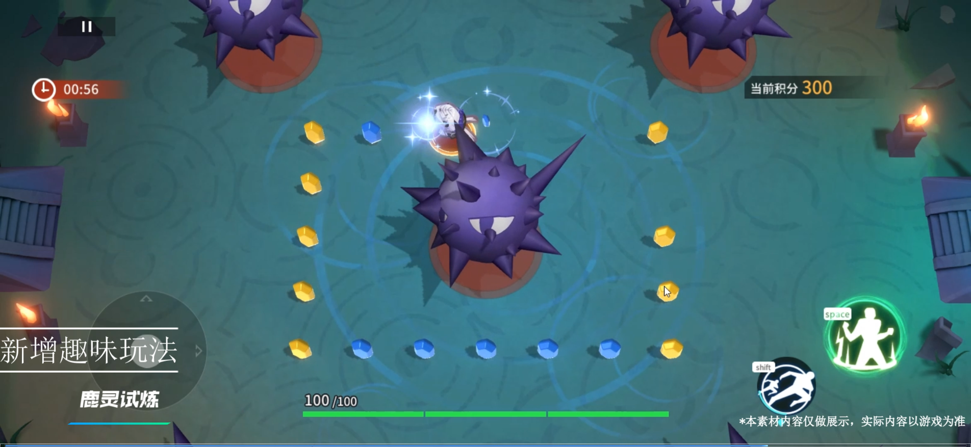 玩家操纵艾莉西亚接受鹿灵的试炼,期间需要躲避各种机关拾取对应的积分道具来争取最高的分数,从而获得丰富奖励。