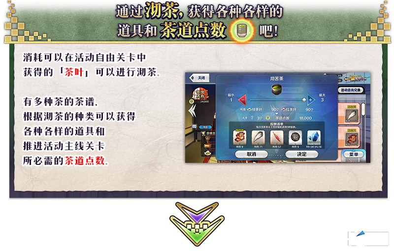 限时活动「非同寻常茶道之战 唠唠叨叨新邪马台国 从地狱归来的男人」中,沏茶可以获得推进活动主线关卡必需的「茶道点数」和各种各样的道具。