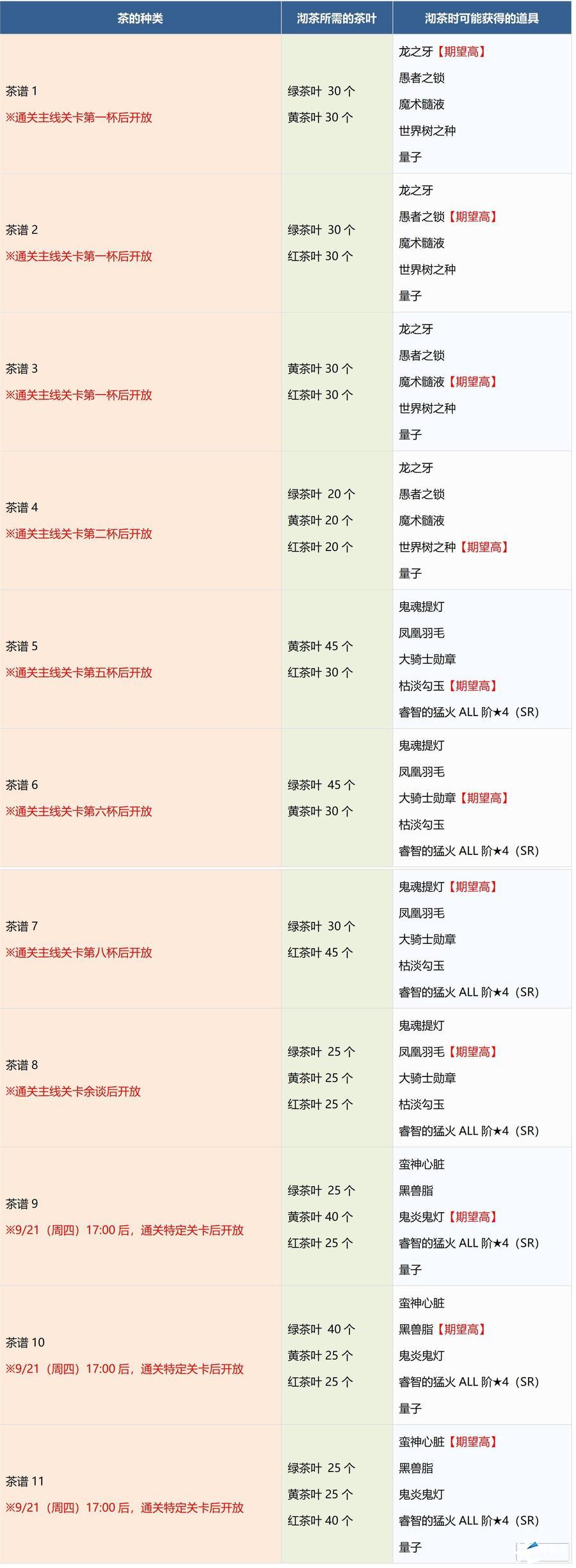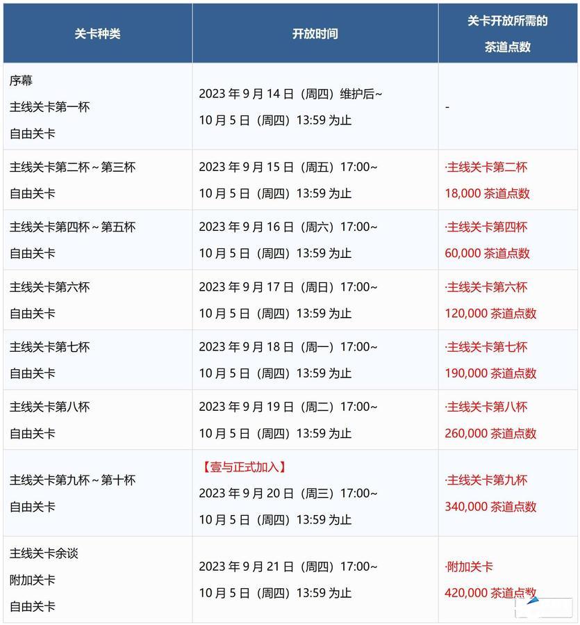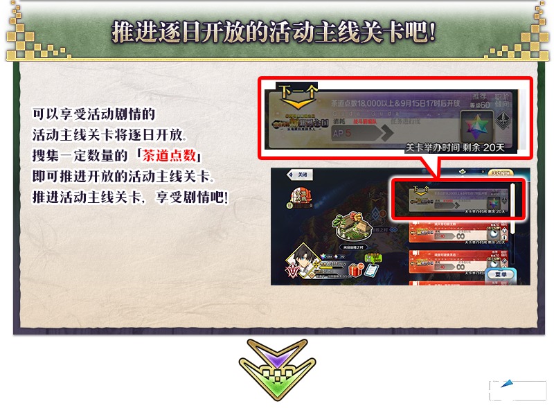 ※根据关卡的推进情况,推进各日程的活动主线关卡需要一定数量以上的茶道点数。