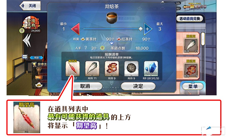 在决定沏茶次数的界面中,在沏茶时可能获得的道具列表中最有可能获得的道具的上方将显示「期望高」!